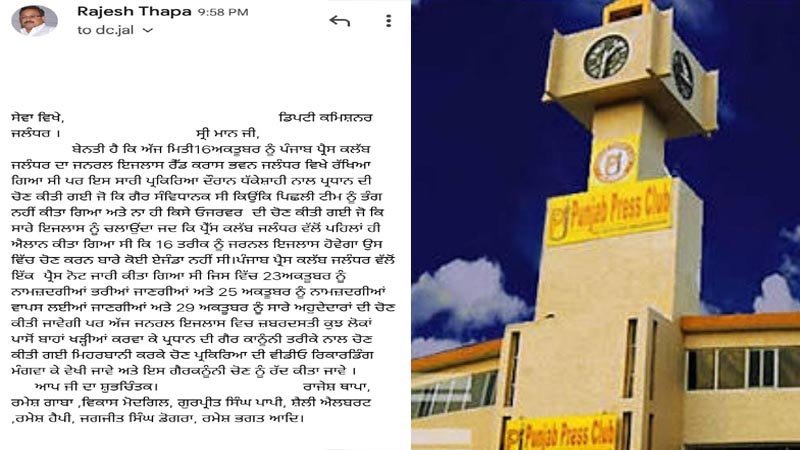 पंजाब प्रेस क्लब की AGM में मनमाने तरीके से प्रधान चुने जाने के गैर संवैधानिक बताते हुए पत्रकार राजेश थापा और अन्य पत्रकारों ने डिप्टी कमिश्वर घनश्याम थोरी से शिकायत की है। राजेश थापा ने शिकायत में लिखा है कि प्रधान लखविंदर सिंह जौहल ने पंजाब प्रेस क्लब के संविधान को तार-तार कर दिया है।