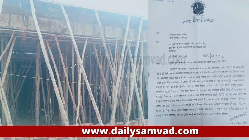 डेली संवाद, जालंधर। Jalandhar News: जालंधर वेस्ट हलके में अवैध रूप से बन रहे कामर्शियल इमारत के मालिक को नगर निगम ने नोटिस जारी किया है। यह अवैध इमारत वीर बबरीक चौक के पास बन रही है। निगम कमिश्नर के आदेश पर अवैध निर्माण करवाने वाले व्यक्ति को नोटिस जारी हुआ है।