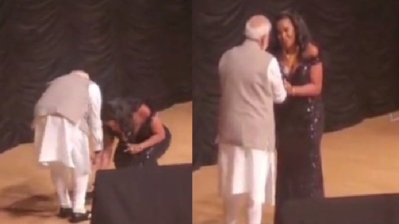 American singer Mary Milliben, after singing India’s national anthem, touches Prime Minister Modi’s feet… Earlier Prime Minister of PNG, in a moving gesture, had bowed down in reverence. The world respects PM Modi’s powerful spiritual aura and rootedness in Indian values and… pic.twitter.com/qoA7ALLA3U