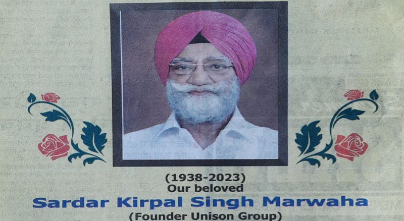 डेली संवाद, जालंधर। Jalandhar News: यूनिसन ग्रुप (Unison Group) के फाउंडर चेयरमैन स्व. स. किरपाल सिंह मरवाहा 29 जुलाई को आकस्मिक निधन हो गया। उनकी आत्मिक शांति के लिए रखे पाठ का भोग व अंतिम अरदास आज यानि 6 अगस्त को दोपहर 12 बजे से लेकर 1.30 बजे तक गुरुद्वारा नौंवी पातशाही जीटीबी नगर में होगी।