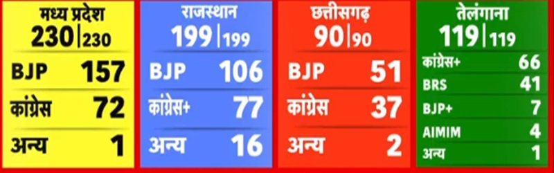 डेली संवाद, नई दिल्ली। Assembly Election Result 2023: राजस्थान, छत्तीसगढ़, मध्यप्रदेश और तेलंगाना विधानसभा चुनाव के बाद आज सुबह 8 बजे से मतगणना शुरु हुई। चुनावी नतीजों के रुझान में भाजपा तीन प्रदेशों में सबसे आगे है।