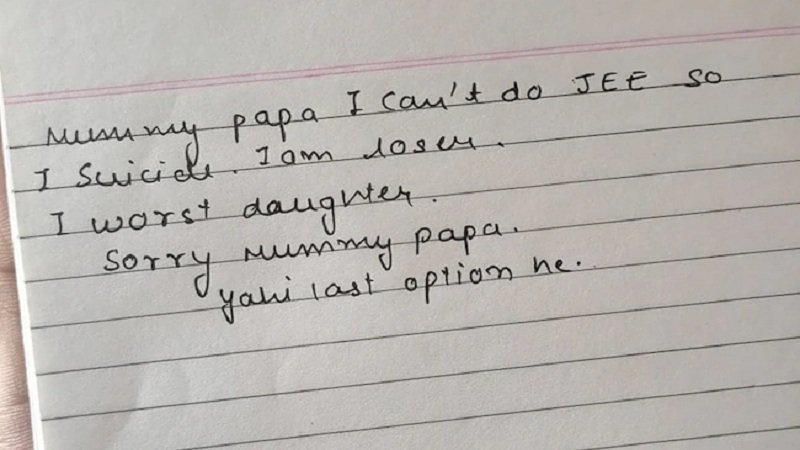 पुलिस को निहारिका के शव के साथ एक सुसाइड नोट भी मिला है। इसमें निहारिका ने लिखा है, “मम्मी, पापा, मैं जेईई नहीं कर सकती। इसलिए मैंने आत्महत्या कर ली है। मैं लूजर हूं। मैं सबसे खराब बेटी हूं। मुझे माफ करना, मम्मी, पापा। यह मेरे पास आखिरी विकल्प है।”