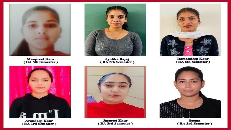 जानकारी देते हुए कॉलेज कोर्डिनेटर हरप्रीत कौर ने बताया कि बी.ए. के पांचवें सेमेस्टर में मनप्रीत कौर पहले, जोतिका बजाज दूसरे और रमनदीप कौर तीसरे स्थान पर रहीं इसके इलावा बी.ए. के तीसरे सेमेस्टर में अरनदीप कौर पहले, जसमीत कौर दूसरे और सीमा तीसरे स्थान पर रहीं।
