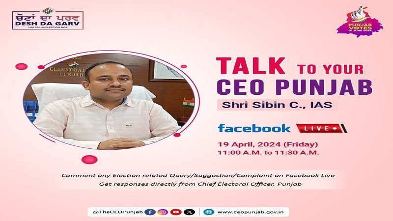 सिबिन सी ने बताया कि उनकी तरफ से फेसबुक पर @TheCeoPunjab के अधिकारित पेज पर लाइव होकर 19 अप्रैल दिन शुक्रवार को सुबह 11.00 बजे से 11.30 बजे तक लोक सभा मतदान से जुड़े लोगों के सवालों के जवाब दिए जाएंगे। उन्होंने आगे कहा कि कोई भी व्यक्ति इस आधे घंटे के लाइव सैशन के दौरान उनको कूमैंट करके सवाल पूछने के इलावा अपनी शिकायतें और सुझाव भी दे सकता है।