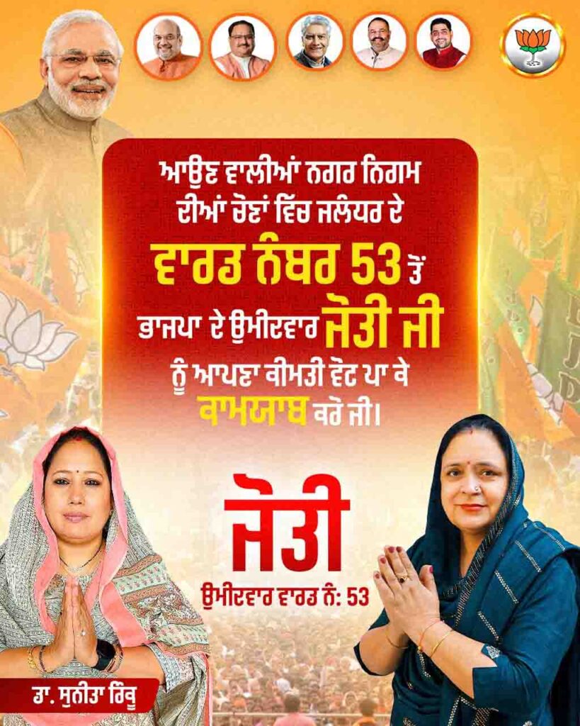 डेली संवाद, जालंधर। Jalandhar News: भारतीय जनता पार्टी (BJP) की तरफ से जालंधर (Jalandhar) के वार्ड-53 की उम्मीदवार ज्योति भारी मतों से जीत हासिल करेंगी। ज्योति के लिए वार्ड के हर मोहल्ले औऱ गली में लोग खुद प्रचार कर रहे हैं। लोग घर-घर जाकर ज्योति के लिए वोट मांग रहे हैं।
