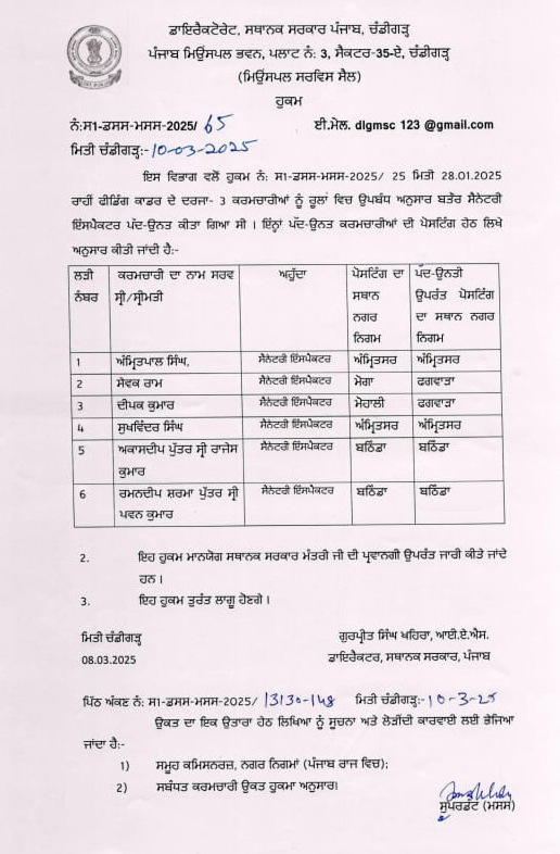 पंजाब (Punjab) में स्थानीय निकाय विभाग ने 6 अफसरों के तबादलेे किए हैं। इसमें सभी सैनेटरी इंस्पैक्टर शामिल है। अमृतसर, फगवाड़ा और बठिंडा नगर निगम में इन्हें भेजा गया है।