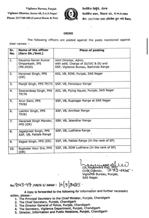 इसके अलावा मनजीत सिंह को SSP विजिलेंस फिरोजपुर रेंज, अरुण सैनी को SSP विजिलेंस रूपनगर रेंज, लखबीर सिंह को SSP विजिलेंस अमृतसर रेंज, हरप्रीत सिंह को SSP विजिलेंस जालंधर रेंज, जगतप्रीत सिंह को एसएसपी विजिलेंस लुधियाना रेंज लगाया गया है।