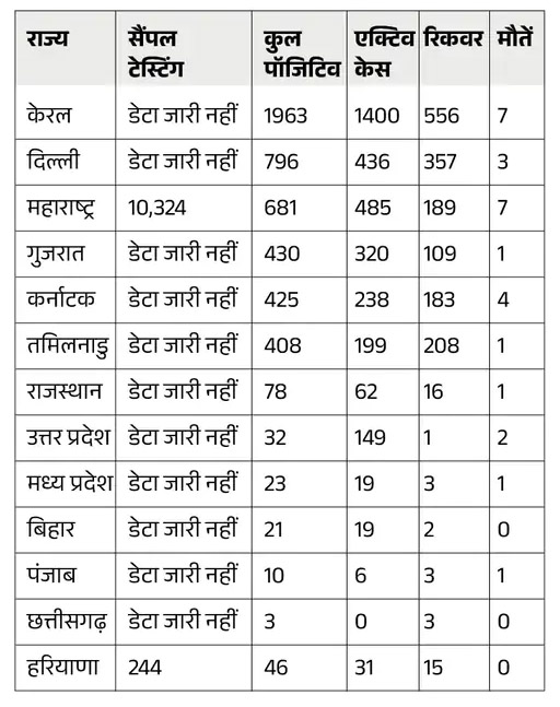 स्वास्थ्य विभाग की रिपोर्ट के मुताबिक कोरोना से जान गंवाने वालों की संख्या 28 पहुंच गई है। इनमें सबसे ज्यादा मौतें महाराष्ट्र (Maharashtra) और केरल में 7-7 हैं। बीते तीन दिन में 21 की मौत हुई है। 31 मई को बेंगलुरु में 63 साल के मरीज की जान चली गई। उसने वैक्सीन की तीनों डोज ली थीं।