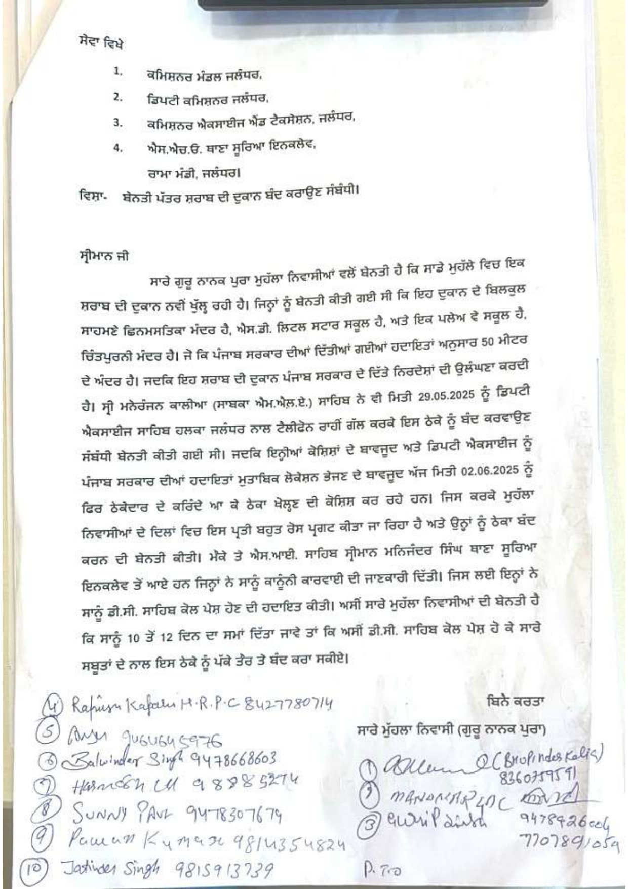 डेली संवाद, जालंधर। Jalandhar News: जालंधर (Jalandhar) के गुरु नानक पुरा की मार्किट में स्कूल और मंदिर के पास शराब ठेका खोलने का मामला तूल पकड़ता जा रहा है। कालोनी और बाजार के लोगों द्वारा लगातार विरोध प्रदर्शन करने के बाद भी शराब ठेकेदार मंदिर और स्कूल के पास ठेका खोलना चाहता है। जिसे लेकर अब डीसी, एक्साइज विभाग और पुलिस को लिखित में शिकायत दर्ज करवाई गई है।