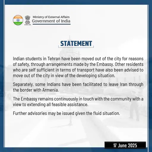 इसमें कहा गया है कि फौरन तेहरान छोड़ दें। सभी भारतीय नागरिकों को सलाह दी गई है कि तेहरान छोड़कर किसी सुरक्षित जगह पर जाएं। इस तनाव की चपेट में तेहरान में पढ़ने वाले करीब 140 भारतीय छात्र भी आ गए हैं।