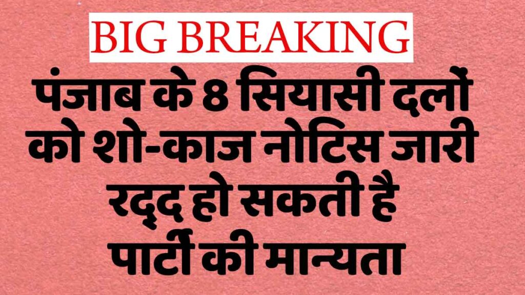 डेली संवाद, चंडीगढ़। Punjab News: Show-cause notice issued to political parties of Punjab – चुनाव आयोग (Election Commission) ने बड़ी कार्रवाई की है। पंजाब (Punjab) चुनाव आयोग ने राज्य के 8 सियासी दलों को शो-काज नोटिस जारी किया है। यह कार्ऱवाई उस समय की गई है, जब 2027 के विधानसभा चुनाव की सभी सियासी दल तैयारी में जुटे हैं। पंजाब के मुख्य निर्वाचन अधिकारी सिबिन सी (Cibin C) ने इसकी पुष्टि की है।उनके मुताबिक चुनाव आयोग द्वारा 8 पंजीकृत गैर-मान्यता प्राप्त राजनीतिक दलों को कारण बताओ नोटिस जारी किए गए हैं।