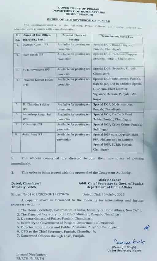 पंजाब (Punjab) पुलिस में प्रमोशन हुए हैं। इसमें नरेश कुमार को स्पेशल डीजीपी ह्यूमन राइट्स की जिम्मेदारी दी गई है। वहीं राम सिंह को स्पेशल डीजीपी टेक्निकल सपोर्ट सर्विसेज पंजाब, एसएस श्री वास्तव को स्पेशल डीजीपी सिक्योरिटी पंजाब, प्रवीन कुमार को स्पेशल डीजीपी इंटेलिजेंस के अतिरिक्त स्पेशल डीजीपी कम चीफ डायरेक्टर विजिलेंस ब्यूरो पंजाब, और अनीता पुंज को स्पेशल डीजीपी कम डायरेक्टर एमआरएस पीपीए के पद पर नियुक्त किया गया है।