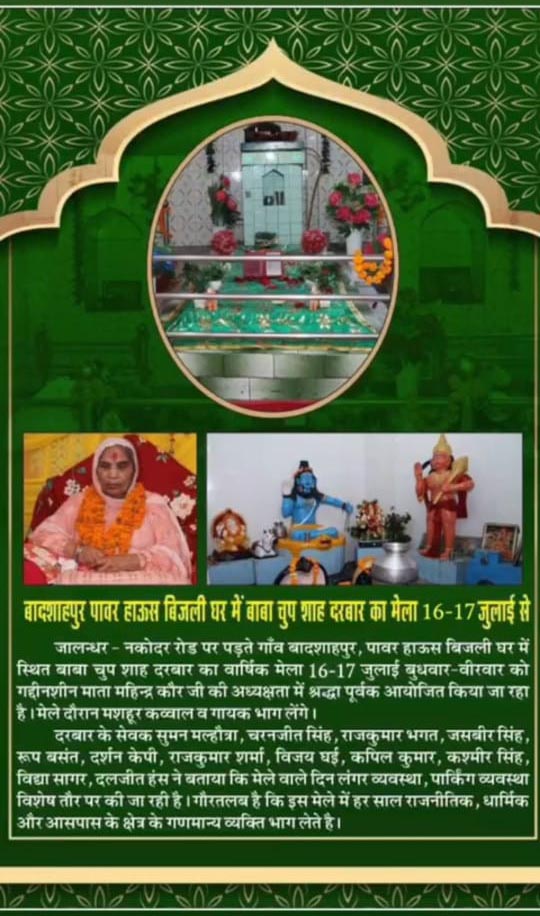 नकोदर रोड पर पड़ते गांव बादशाहपुर पावर हाउस बिजली घर में स्थित बाबा चुप शाह दरबार में हर साल की तरह इस बार भी वार्षिक मेले का आयोजन किया गया। दरबार की गद्दीनशीन माता महिंद्र कौर जी की अध्यक्षता में वार्षिक मेले को श्रद्धापूर्वक आयोजित किया गया। मेले में मशहूर कव्वाल और गायकों ने हिस्सा लिया।