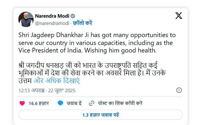 उपराष्ट्रपति जगदीप धनखड़ (Jagdeep Dhankhar) के इस्तीफे के मंजूरी के बाद प्रधानमंत्री नरेंद्र मोदी (PM Narendra Modi) ने एक्स पर पोस्ट लिखा है। उन्होंने लिखा है, “जगदीप धनखड़ जी को भारत के उपराष्ट्रपति सहित कई भूमिकाओं में देश की सेवा करने का अवसर मिला है। मैं उनके उत्तम स्वास्थ्य की कामना करता हूं।”