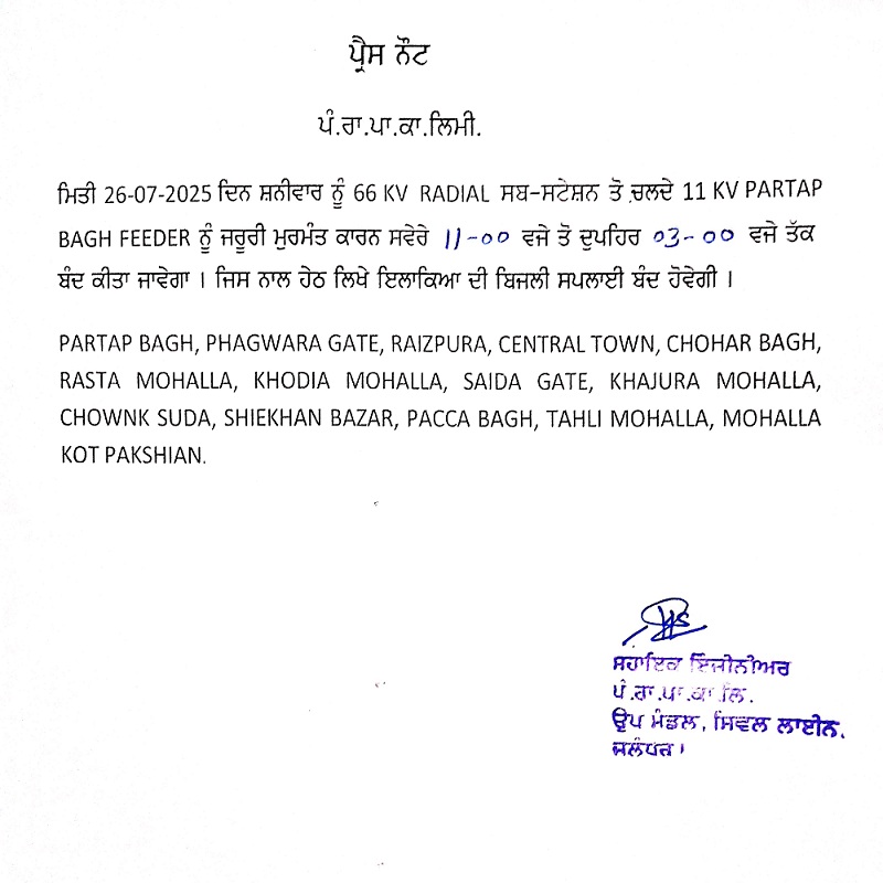 बता दे कि जालंधर के फगवाड़ा गेट, प्रताप बाग का एरिया, रायजपुरा, चहार बाग, रस्ता मोहल्ला, खोदियां मोहल्ला, सैदां गेट, खजुरां मोहल्ला, चौक सूदां, शेखां बाजार, पक्का बाग, टाली मोहल्ला, कोट पक्षियां में सुबह 11 बजे से लेकर दोपहर 3 बजे तक बिजली बंद रहेगी।