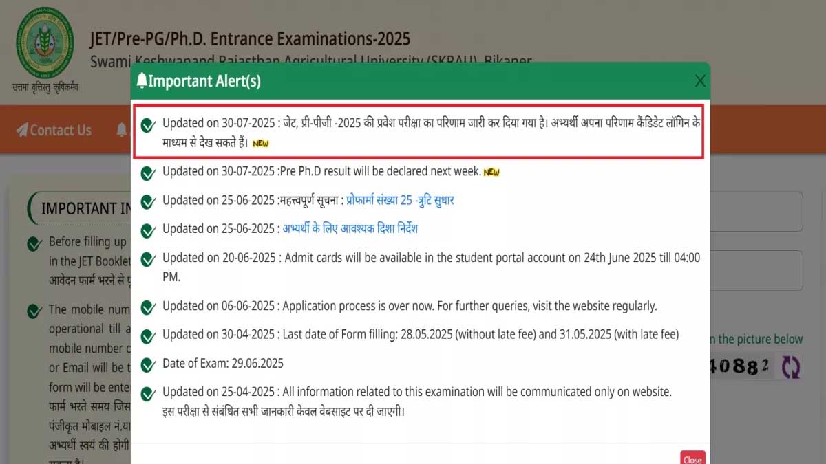 डेली संवाद, नई दिल्ली। Rajasthan JET Result 2025 OUT: राजस्थान ज्वाइंट एंट्रेस टेस्ट (JET 2025) का रिजल्ट जारी हो गया है। स्टूडेंट्स स्वामी केशवानंद राजस्थान कृषि विश्वविद्यालय (SKRAU) की ऑफिशियल वेबसाइट jetskrau2025.com पर नतीजे चेक कर सकते हैं। इसके साथ ही स्टूडेंट्स इस पेज पर दिए लिंक से भी लॉग इन डिटेल दर्ज करके परिणाम की जांच करने के साथ ही स्कोरकार्ड डाउनलोड कर सकते हैं।