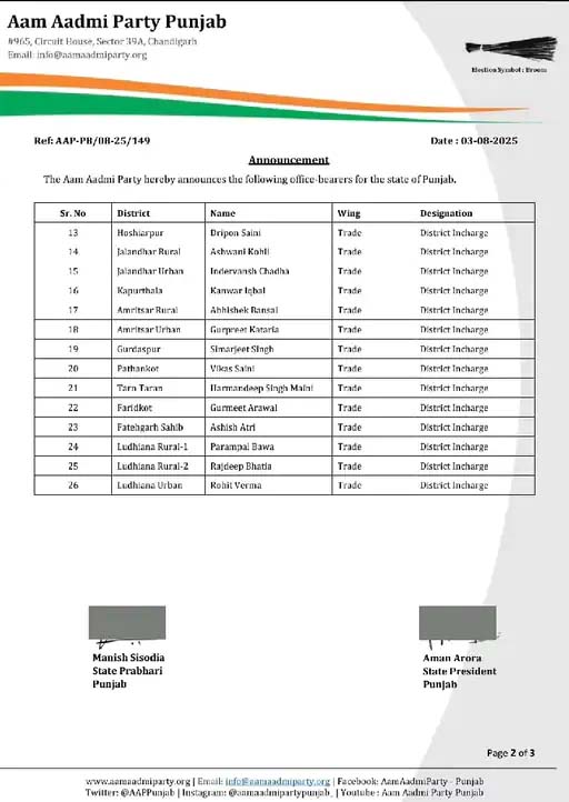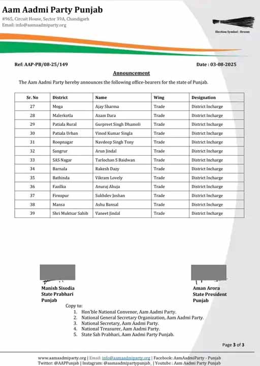 AAP विधानसभा चुनाव 2027 की तैयारियों में जुट गई है। इस कड़ी में संगठन को मजबूत किया जा रहा है। पिछले कुछ समय कई विभागों के चेयरमैन व डायरेक्टर की नियुक्ति की गई थी। फिर हलका इंचार्ज लगाए गए थे। वहीं, अब व्यापार विंग पर फोकस किया गया है।
