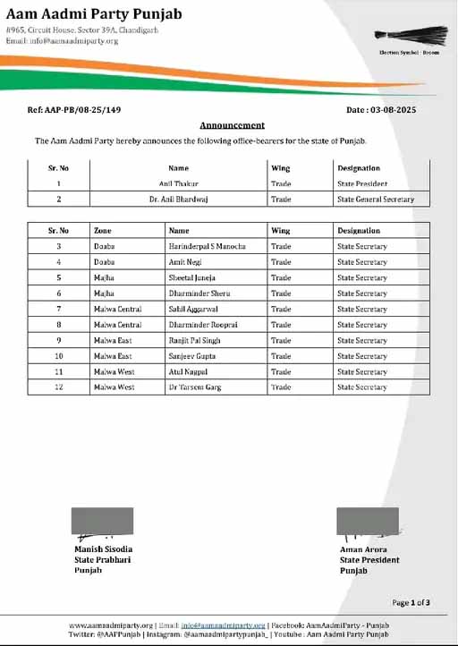 डेली संवाद, चंडीगढ़। Punjab News: पंजाब की आम आदमी पार्टी (AAP) ने अपने व्यापार विंग (Trade Wing) का ऐलान कर दिया है। अनिल ठाकुर को प्रदेश अध्यक्ष और डॉ. अनिल भारद्वाज को प्रदेश महासचिव नियुक्त किया गया। जबकि 10 प्रदेश सचिव बनाए गए। सभी जिलों के ट्रेड विंग अध्यक्षों की भी घोषणा की गई है।