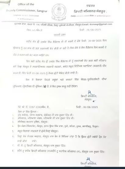 संगरूर के उपायुक्त ने एक पत्र जारी कर स्थानीय अवकाश घोषित किया है। साथ ही, पत्र में कहा गया है कि ये आदेश उन स्कूलों और कॉलेजों पर लागू नहीं होंगे जहाँ बोर्ड या विश्वविद्यालय की परीक्षाएँ चल रही हैं।