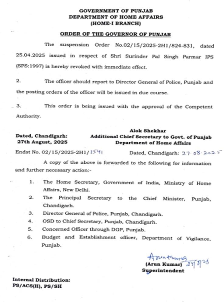 मिली जानकारी के अनुसार पंजाब विजिलेंस सुरिंदर पाल सिंह परमार आईपीएस (एसपीएस:1997) के संबंध में जारी सस्पेंड करने के आदेश संख्या 02/15/2025-2एच1/824-831, दिनांक 25.04.2025 को तत्काल प्रभाव से रद्द किया गया है।