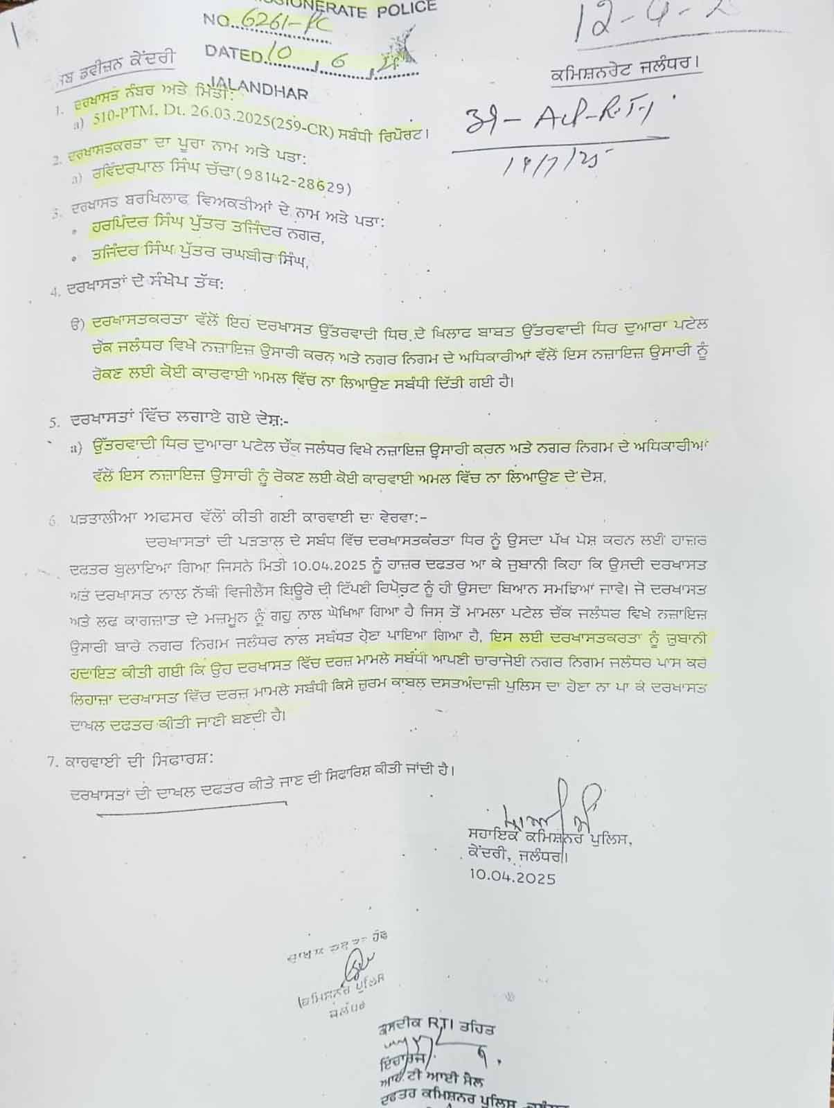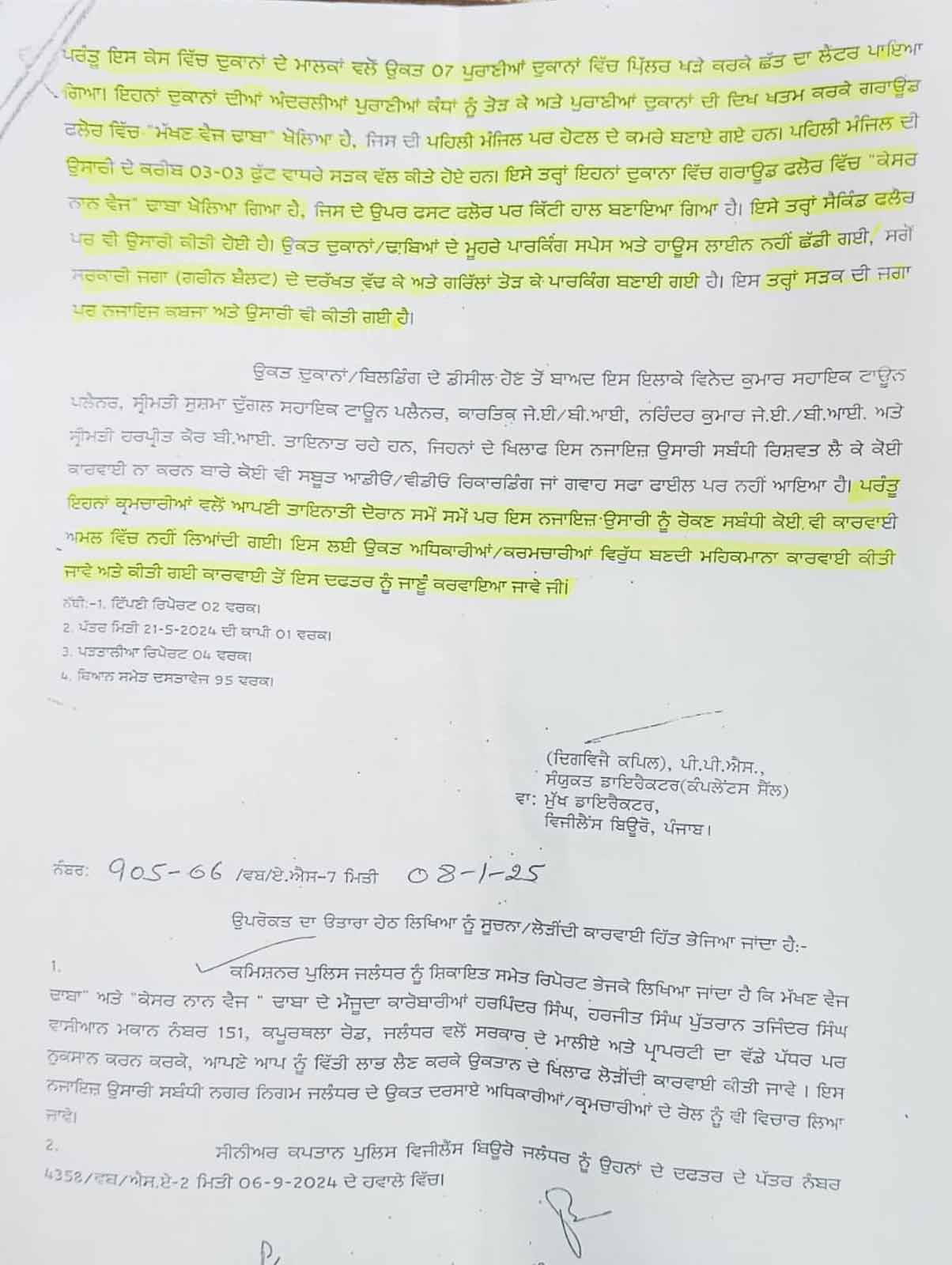 जालंधर (Jalandhar) के आरटीआई (RTI) एक्टिविस्ट रविंदरपाल सिंह चड्ढा ने बताया कि पटेल चौक के पास कुछ दुकानों को खरीद कर केसर नानवेज और मक्खन वेज ढाबा खोल दिया गया। यही नहीं उक्त ढाबे के ऊपरी मंजिल पर किट्टी हाल और होटल के कमरे बनाए गए। इसकी शिकायत उन्होंने नगर निगम के कमिश्नर से की थी। तब इस इमारत के मालिक को नोटिस जारी हुआ था।