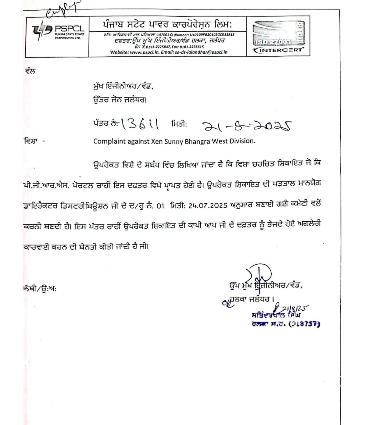 डेली संवाद, जालंधर। Jalandhar News: PSPCL XEN Complaint in Jalandhar- पंजाब स्टेट पावर कारपोरेशन लिमिटेड (PSPCL) के जालंधर स्थित दो अफसरों पर अनियमितिताओं का आऱोप लगा है। पीएसपीसीएल (PSPCL) के एक्सईएन अवतार सिंह और सनी बांगड़ा के खिलाफ पीएसपीसीएल (PSPCL) के चेयरमैन से शिकायत की गई थी, जिसके बाद इन दोनों एक्सईएन की कारगुजारी की जांच के लिए स्पेशल टीम बनाई गई है।