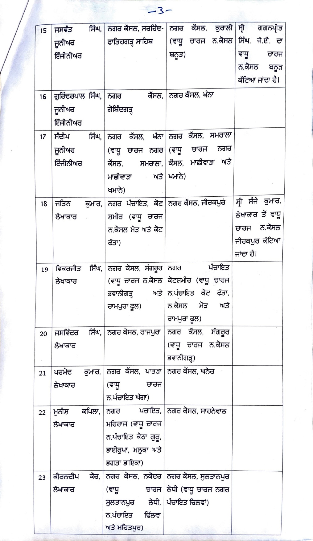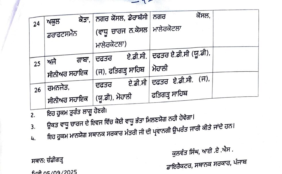 पंजाब (Punjab) सरकार ने स्थानीय निकाय विभाग के 26 अफसरों और इंजीनियरों का तबादला कर दिया। इसमें नगर कौंसिल और नगर पंचायत के ज्यादातर इंजीनियर शामिल हैं। इसके साथ ही कई इंजीनियरों को अतिरिक्त कार्यभार भी सौंपा गया है।