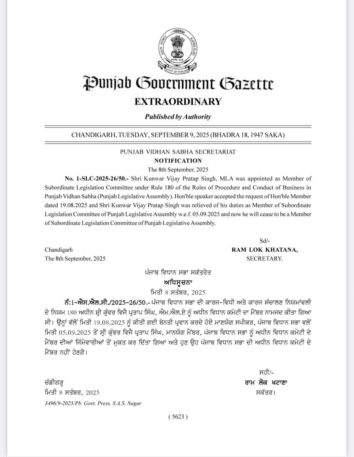 मिली जानकारी के मुताबिक पंजाब विधानसभा स्पीकर कुलतार सिंह संधवां ने पंजाब विधानसभा की समिति से अमृतसर (Amritsar) के विधायक कुंवर विजय प्रताप (Kunwar Vijay Partap) का इस्तीफा स्वीकार कर लिया है।