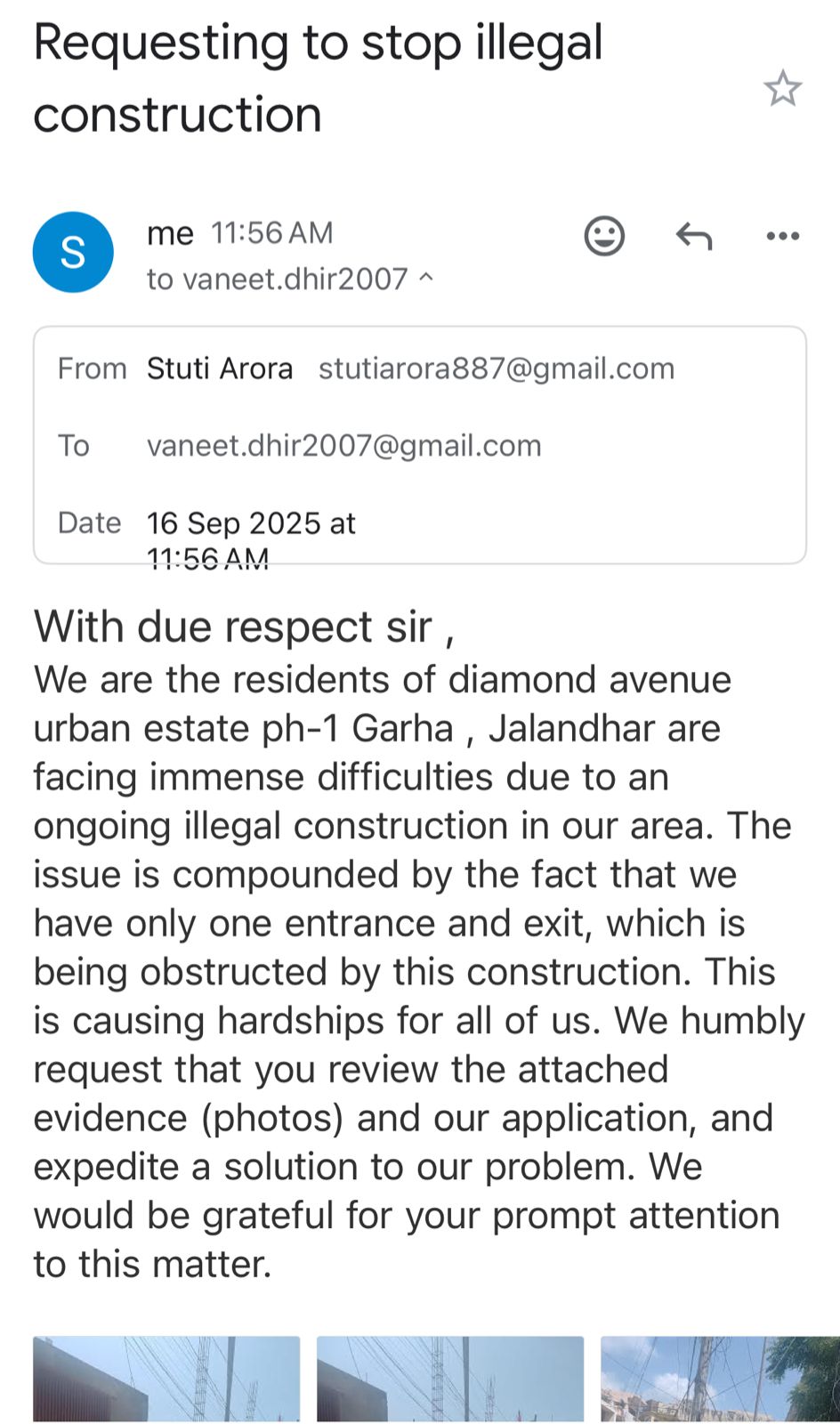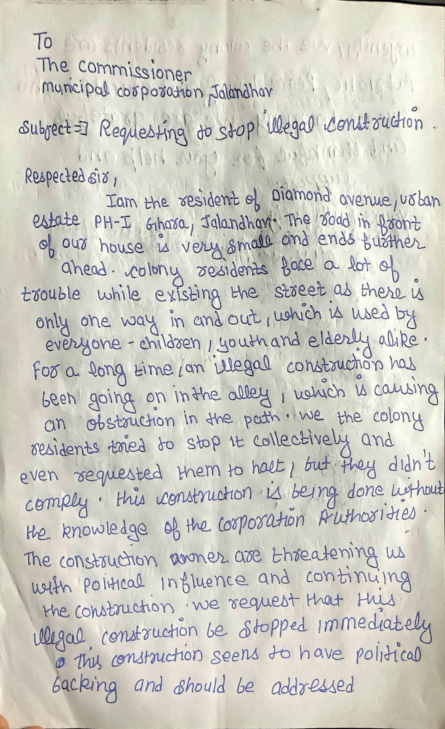 कालोनी के लोगों ने कहा कि बगैर नक्शे की ही निर्माण शुरू किया गया है। जिससे कालोनी के लोगों को बड़ा खतरा पैदा कर दिया। उन्होंने कहा कि कमिश्नर से शिकायत के बाद कुछ देर तक काम रुका रहा, लेकिन बिल्डिंग इंस्पैक्टर के जाते ही फिर से काम शुरू कर दिया गया।