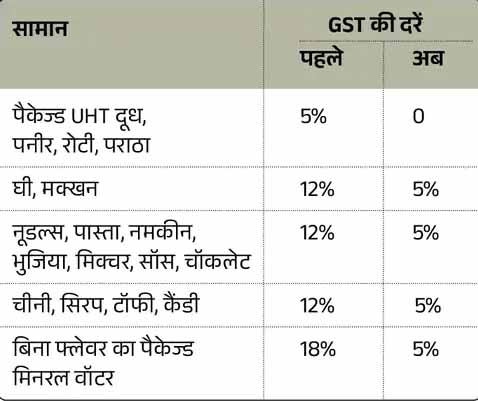 कुछ सामान जैसे छेना, पनीर, रोटी, चपाती, पराठा पर अब कोई टैक्स नहीं लगेगा। तंबाकू को छोड़कर नई दरें सभी सामानों पर कल 22 सितंबर से लागू होंगी।