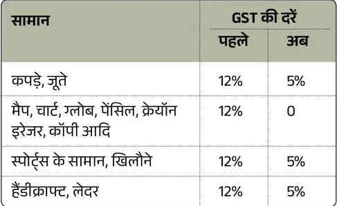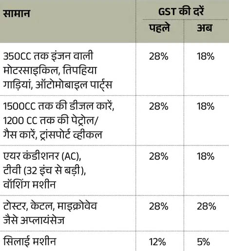 सीमेंट पर टैक्स 28% से 18% हुआ, इससे घर बनाने या मरम्मत का खर्च कम होगा। TV, AC जैसे सामान पर टैक्स 28% से घटकर 18% हो गया है। इससे ये सस्ते होंगे। 33 जरूरी दवाइयां, खासकर कैंसर और गंभीर बीमारियों की दवाओं पर अब कोई टैक्स नहीं।