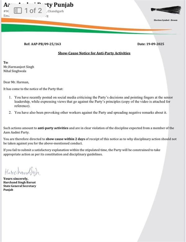 बताया जा रहा है कि पार्टी ने ये कार्रवाई पार्टी-विरोधी गतिविधियों के चलते की है। लैंड पुलिंग नीति का विरोध करने वाले हरमनदीप सिंह दीदारेवाला को पार्टी ने 19 सितंबर को कारण बताओ नोटिस भी जारी किया था।