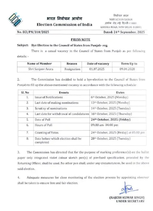 मिली जानकारी के मुताबिक सांसद संजीव अरोड़ा के इस्तीफे से खाली हुई राज्यसभा सीट के लिए उपचुनाव की घोषणा कर दी गई है। राज्यसभा सीट के लिए उपचुनाव 24 अक्टूबर को होगा।