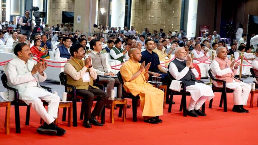 मुख्यमंत्री योगी आदित्यनाथ (Yogi Adityanath) ने गुरुवार को प्रधानमंत्री नरेंद्र मोदी की मौजूदगी में यूपी इंटरनेशनल ट्रेड शो (तृतीय संस्करण) के उद्घाटन समारोह को संबोधित किया। उन्होंने फिरोजाबाद के शिल्पियों द्वारा बनाई गई मां दुर्गा की प्रतिमा प्रधानमंत्री को भेंट की। सीएम ने पार्टनर कंट्री के रूप में रूस के साथ ही यूपीआईटीएस में आए 532 से अधिक फॉरेन बायर्स का भी स्वागत किया। सीएम ने कहा कि यह आयोजन नए भारत के नए यूपी व विकसित भारत के विकसित यूपी को बढ़ाने में कारगर साबित होगा।