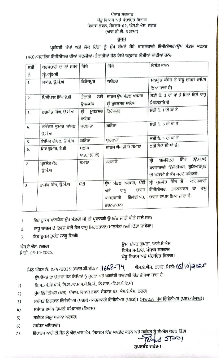 मिली जानकारी के मुताबिक पंजाब सरकार ने जनहित और प्रशासनिक जरूरतों को ध्यान में रखते हुए ग्रामीण विकास एवं पंचायत विभाग के तकनीकी विंग में काम कर रहे कई सहायक/जूनियर इंजीनियरों (सिविल) के तबादले और नियुक्तियां की हैं।