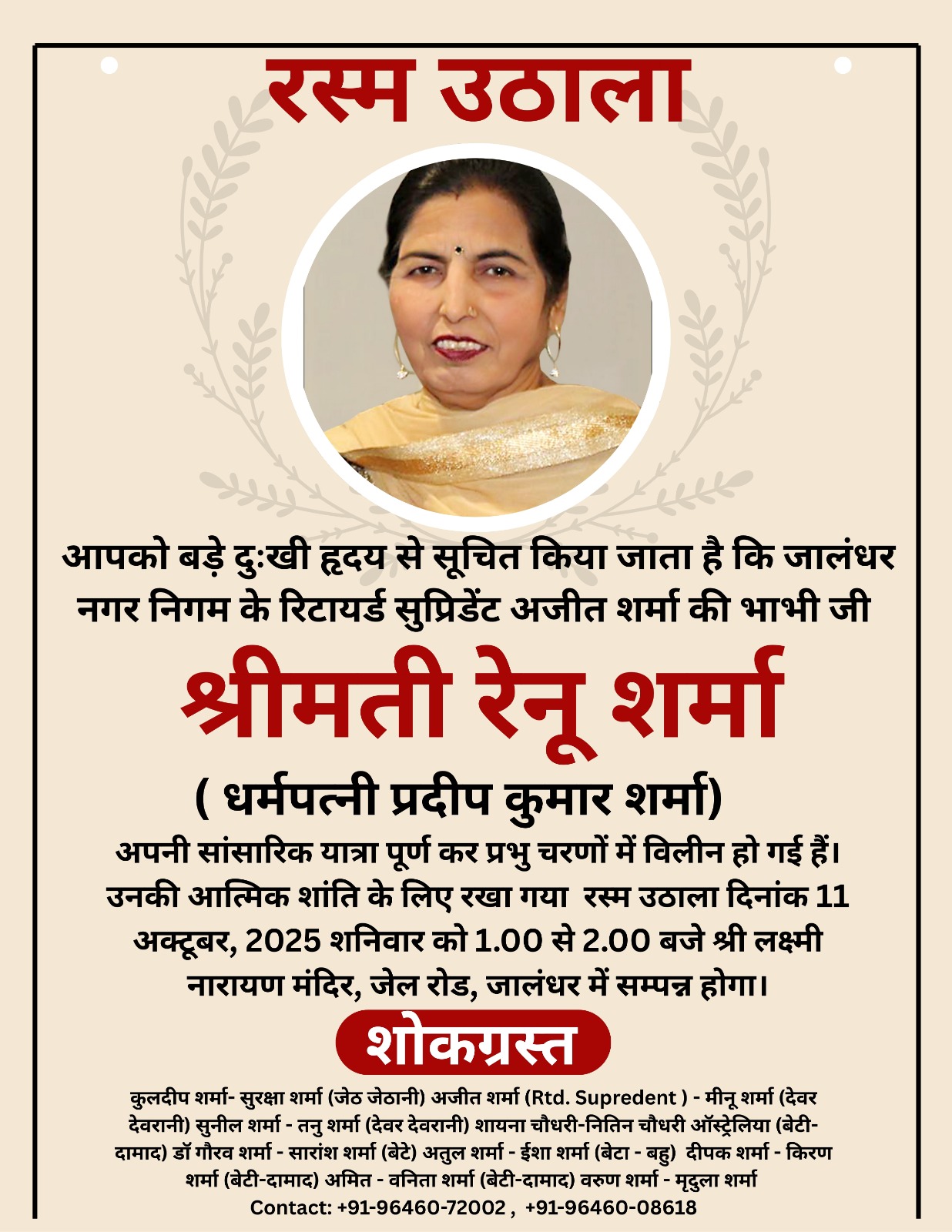 अजीत शर्मा ने बताया के भाभी श्रीमती रेनू शर्मा जी की आत्मिक शांति के लिए रखा गया रस्म उठाला दिनांक 11 अक्टूबर 2025 दिन शनिवार को दोपहर 1 से 2 बजे के बीच श्री लक्ष्मी नारायण मंदिर, जेल रोड जालंधर में संपन्न होगा।