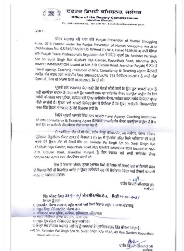 डीसी ऑफिस से जारी आधिकारिक बयान में बताया गया है कि रिंपी इमिग्रेशन ने अपनी इच्छा से अपना लाइसेंस सरेंडर किया था। एजेंसी ने खुद सेवाएं बंद करने का फैसला लिया था और इस संबंध में आवेदन दिया था। उसी आवेदन के आधार पर पीसीएस अधिकारी अमनिंदर कौर ने नियमों के तहत लाइसेंस रद्द किया।