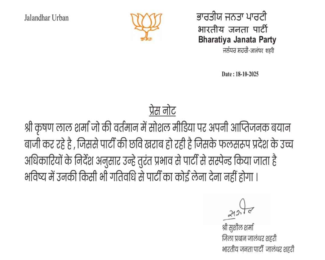 डेली संवाद, जालंधर। Jalandhar BJP News: Jalandhar BJP leader Kishanlal Sharma suspended from the party – भारतीय जनता पार्टी ने जालंधर में बड़ी कार्रवाई की है। जालंधर में भाजपा के प्रधान सुशील शर्मा ने बड़ा एक्शन लिया है। सुशील शर्मा ने भाजपा के वरिष्ठ नेता किशनलाल शर्मा को पार्टी से बाहर निकाल दिया है।