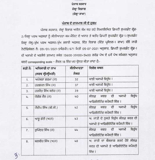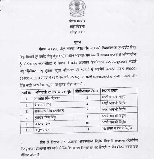 पंजाब सरकार ने जेलों में अधिकारियों के प्रमोट (Promote) किया गया है। पंजाब जेल विभाग (Punjab Jail Department) ने जेल के सुपरीटेंडेटो व डिप्टी सुपरिटेंडेंटो को प्रमोट किया है।