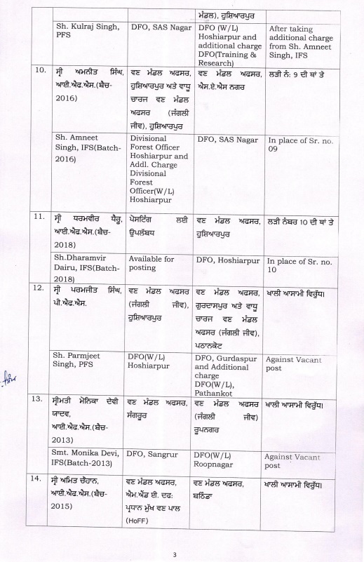 मिली जानकारी के मुताबिक पंजाब सरकार द्वारा भारतीय वन सेवा (IFS) और पंजाब वन सेवा (PFS) के 17 अधिकारियों के तबादले और नई नियुक्तियों के आदेश जारी किए हैं। ये आदेश तत्काल प्रभाव से लागू होंगे।