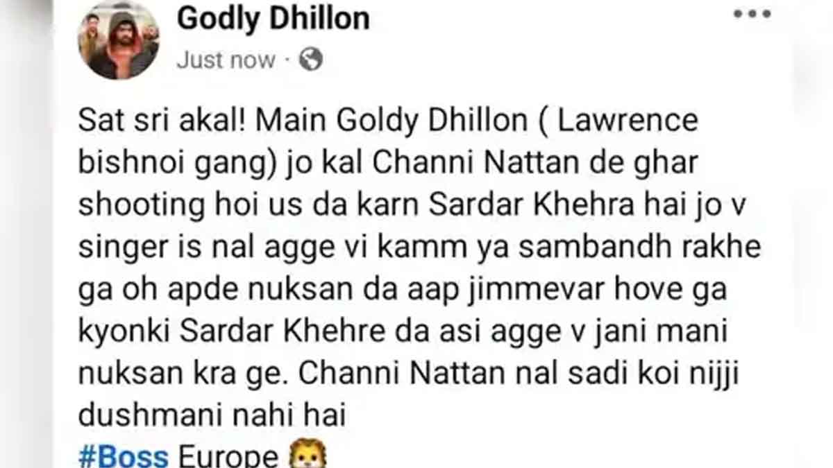 लॉरेंस गैंग ने सोशल मीडिया पोस्ट में लिखा- सत श्री अकाल, मैं गोल्डी ढिल्लों (लॉरेंस गैंग) बोल रहा हूं, जो कल गायक चन्नी नट्टन के घर पर फायरिंग (गोलीबारी) हुई थी, उसका कारण सरदार खैहरा है।
