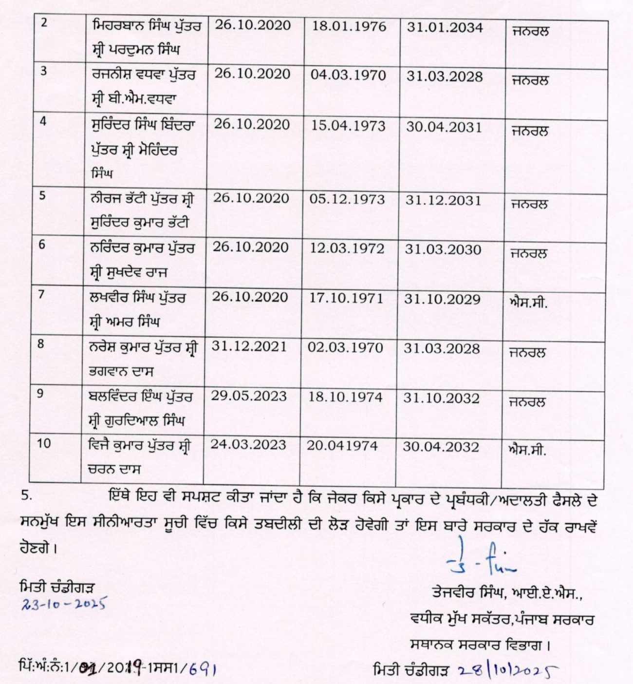 पंजाब (Punjab) सरकार द्वारा जारी की गई वरिष्ठता की सूची में इकबालप्रीत सिंह रंधावा (Iqbalpreet Singh Randhawa) जहां पहले नंबर हैं, वहीं दूसरे नंबर पर अमृतसर समेत जालंधर में कार्यरत एमटीपी मेहरबान सिंह (Meharban Singh) हैं। एमटीपी रजनीश बधवा तीसरे और सुरिंदर बिंद्रा चौथे स्थान पर हैं।
