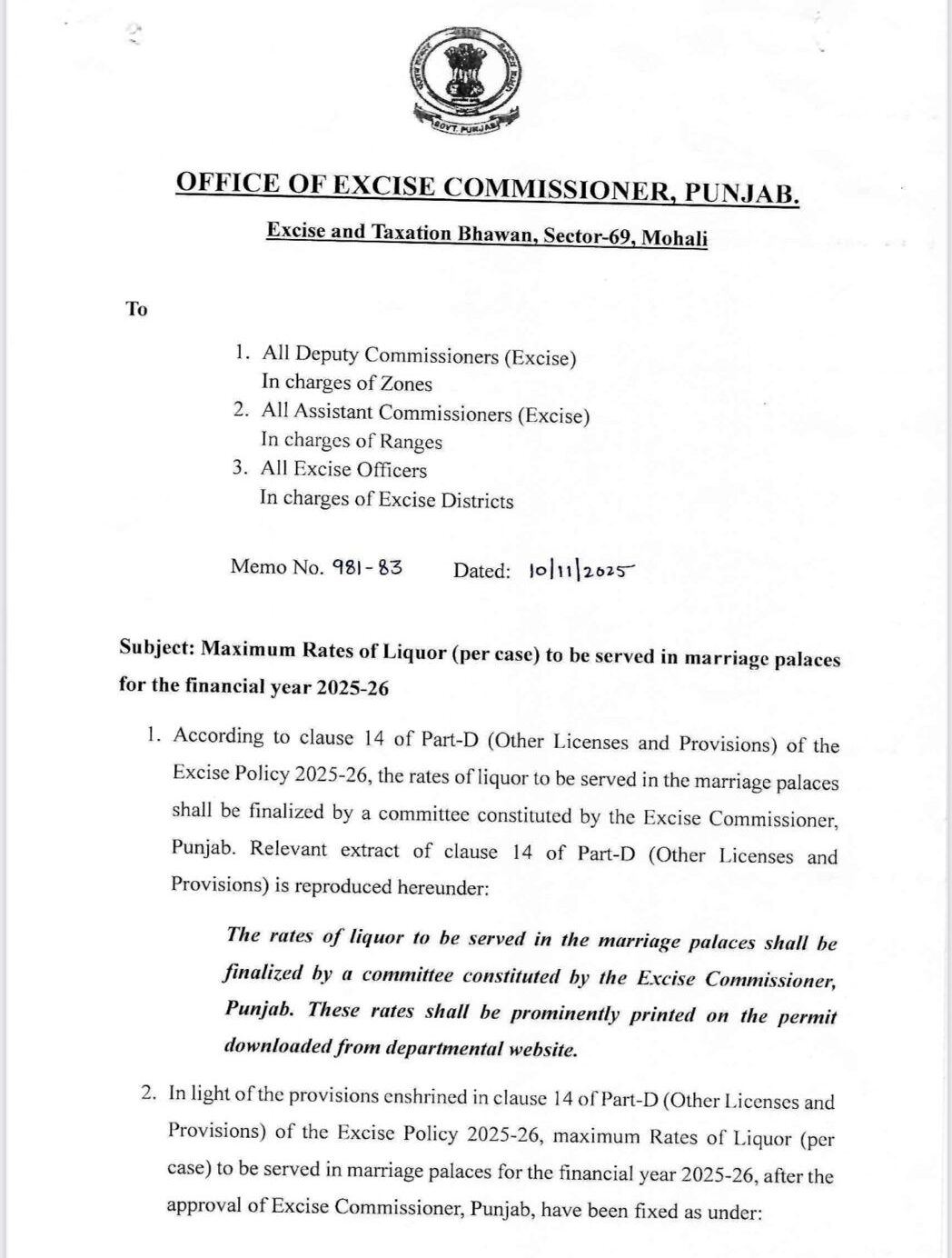 पंजाब एक्साइज विभाग (Excise Commissioner Punjab) ने शराब की कीमत को तय करते हुए लिस्ट जारी की है। इस लिस्ट के मुताबिक ही शराब ठेकेदारों को शराब बेचनी होगी। आईए नीचे पढ़ते हैं शराब की तय की गई कीमत और नई रेट लिस्ट।