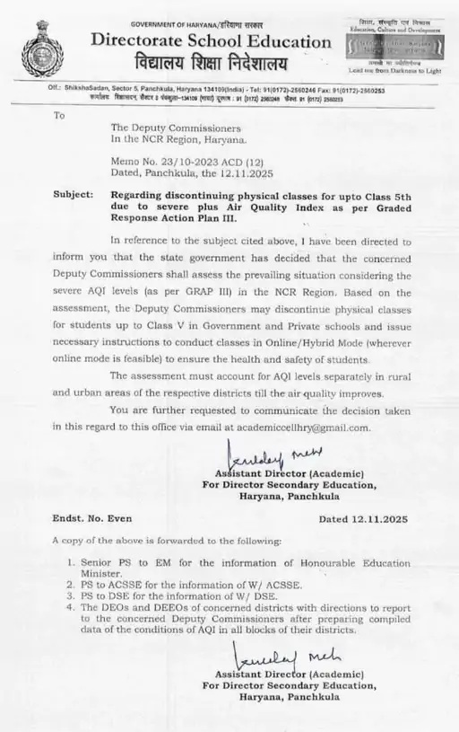 हरियाणा शिक्षा निदेशालय ने सभी जिलों के DC को लेटर जारी कर कहा है कि दिल्ली-NCR में एयर क्वालिटी इंडेक्स (AQI) काफी बढ़ा है। इसलिए गाइडलाइन के अनुसार, 5वीं तक के बच्चों की ऑनलाइन क्लास ही लगाई जाएं। यह नियम सभी सरकारी और प्राइवेट स्कूलों में लागू होगा।