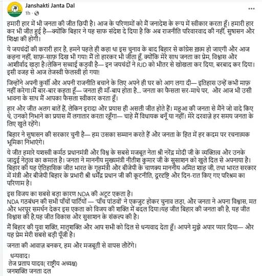 पिछली बार 43 सीटों पर सिमटी JDU की झोली में इस बार 80+ सीटें हैं। वहीं 91 सीटों के साथ BJP सबसे बड़ी पार्टी बनकर उभरी है। बड़े चेहरों में राघोपुर से तेजस्वी यादव करीब 12 हजार वोटों से जीत गए हैं। तेजप्रताप यादव महुआ से चुनाव हार गए हैं। उनकी पार्टी JJD ने हार के बाद फेसबुक पर पोस्ट किया है।