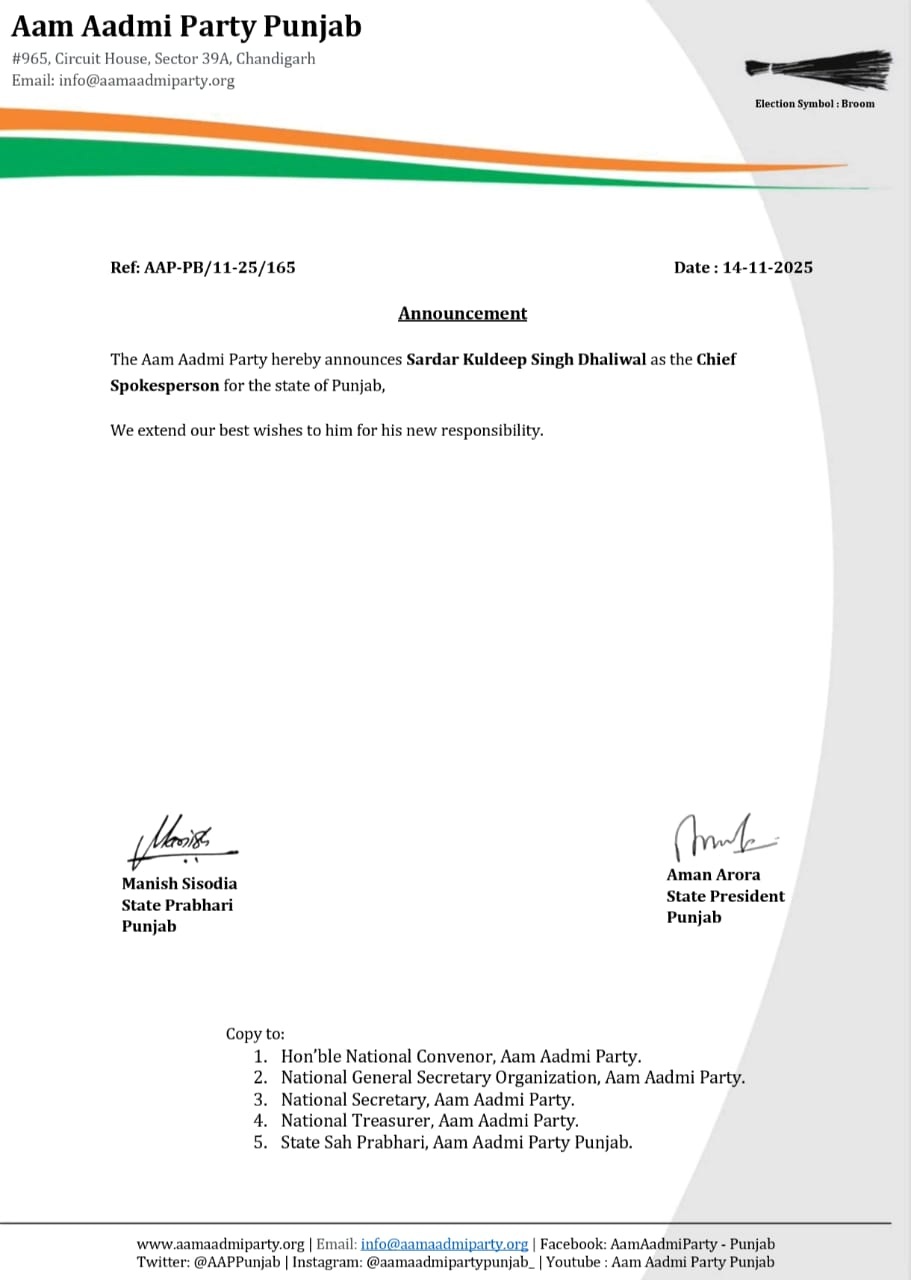 विधायक कुलदीप सिंह धालीवाल को आम आदमी पार्टी (AAP) पंजाब का मुख्य प्रवक्ता नियुक्त किया गया है। इसे लेकर आप सरकार द्वारा आधिकारिक तौर से ऐलान कर दिया गया है।