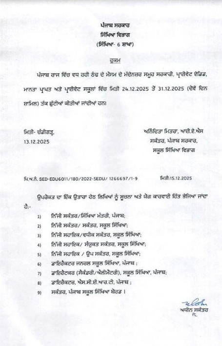शिक्षा विभाग द्वारा जारी नोटिफिकेशन के अनुसार अनुसार, पंजाब के सभी सरकारी और गैर-सरकारी स्कूल 24 दिसंबर से 31 दिसंबर तक बंद रहेंगे। बता दे कि ये फैसला बढ़ती ठंड को देखते हुए लिया है।