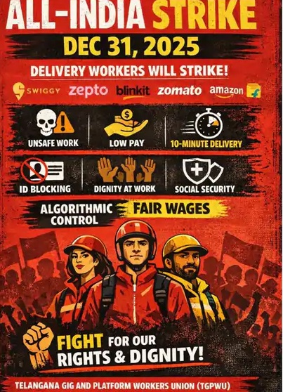 इस हड़ताल से नव वर्ष की पूर्व संध्या के जश्न में बाधा आ सकती है, क्योंकि भोजन, किराने का सामान और अन्य ऑनलाइन डिलीवरी की मांग सामान्य से अधिक है। बता दे कि डिलीवरी पार्टनर अपनी घटती कमाई, असुरक्षित 10 मिनट की डिलीवरी मॉडल, सामाजिक सुरक्षा की कमी और एल्गोरिदम के दबाव के खिलाफ आवाज उठा रहे हैं।