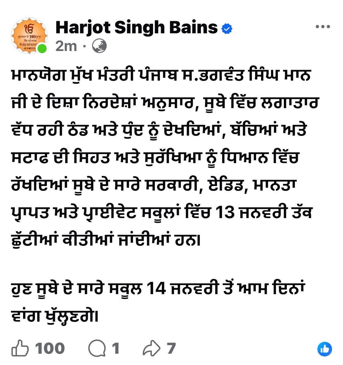 उन्होंने कहा राज्य में लगातार ठंड और धुंध बढ़ रही है। बच्चों और स्टाफ की सेहत व सुरक्षा को देखते हुए स्कूलों की छुट्टियां 13 जनवरी तक रहेंगी। यह आदेश सभी सरकारी, एडेड, मान्यता प्राप्त और प्राइवेट स्कूलों पर लागू होंगे।