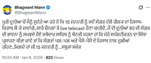 उन्होंने कहा कि उन्हें दुनिया भर से संदेश मिल रहे हैं कि 15 जनवरी को जब संगत गोलक का हिसाब-किताब करेगी, तो उसका सीधा प्रसारण सभी चैनलों पर किया जाना चाहिए। उन्होंने कहा कि मैं भी दुनिया भर की संगत की भावना को समझते हुए जत्थेदार को विनती करता हूं कि मेरे स्पष्टीकरण का सीधा प्रसारण किया जाए। ताकि संगत पल-पल और पैसे के हिसाब–किताब से जुड़ी रहे। मिलते हैं जी 15 जनवरी को, सबूतों समेत।